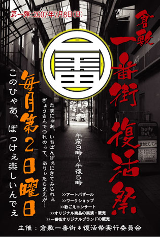 2007/07/08-「倉敷一番街復活祭」 CREATIVE COLLABORATION!type-KURA の挑戦の巻き 「倉式」が地域活性化イベントに初参加! 全面的に支援! ![]() 衰退した商店街に 「倉式」が何ができるのか? 倉敷一番街復活祭 |